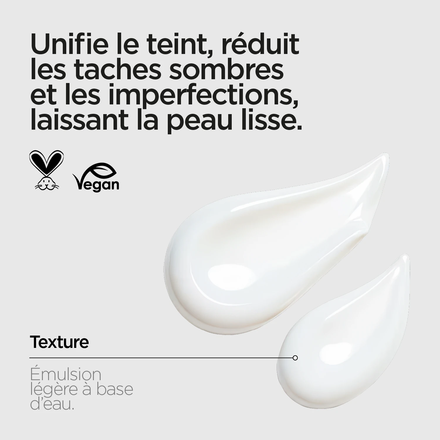 Le produit cible les peaux ternes, le teint irrégulier, les bosses et les imperfections.