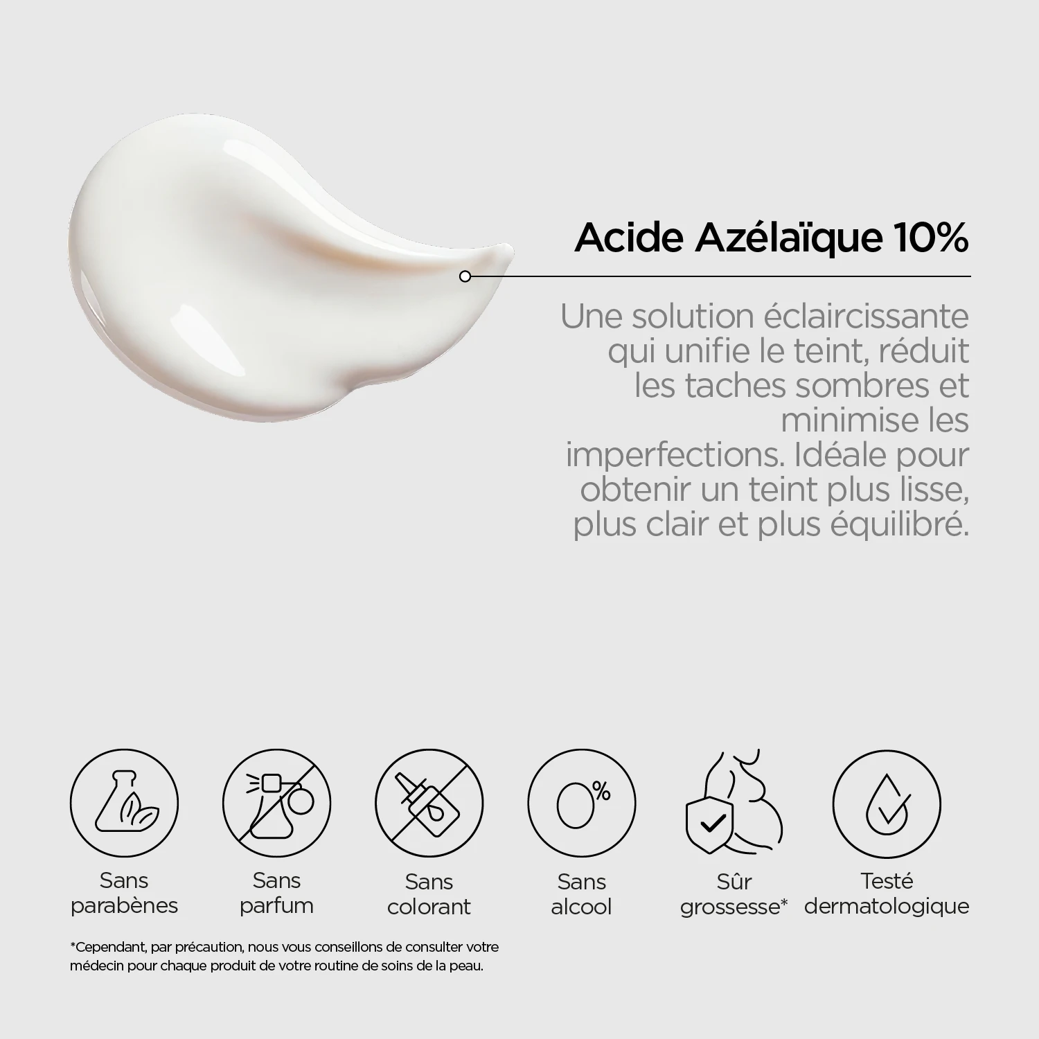 CONVIENT-IL AUX PEAUX À TENDANCE ACNÉIQUE ? Oui, l’acide azélaïque élimine efficacement les bactéries responsables de l’acné, ce qui contribue à atténuer l’apparence des imperfections cutanées et à affiner le grain de peau.