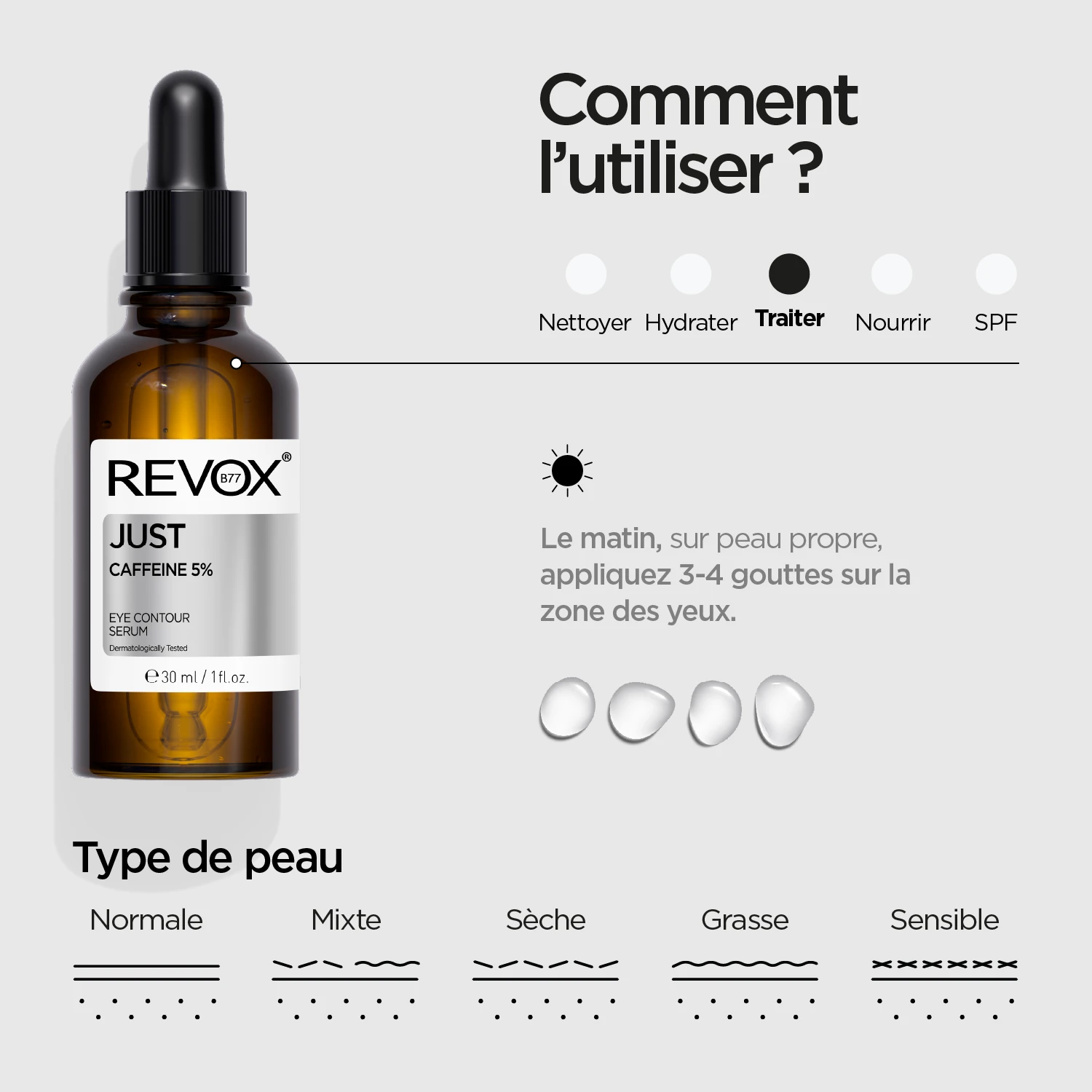 Attention : Evitez d’utiliser REVOX B77 JUST Caféine 5% le soir pour éviter la déshydratation de la peau. Une intolérance individuelle au produit est possible. Avant la première application, il est recommandé d’effectuer un test de sensibilité. En cas d’inconfort, cesser d’utiliser le produit.