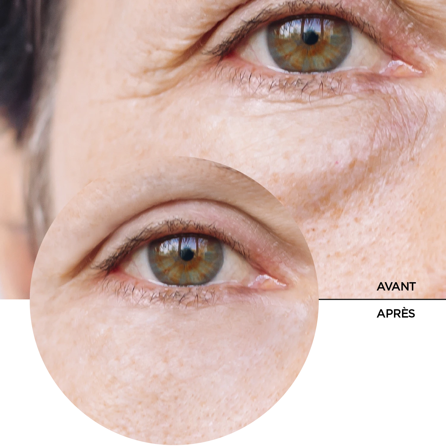 Le produit cible les yeux gonflés, les cernes sous les yeux, la peau fatiguée et terne.