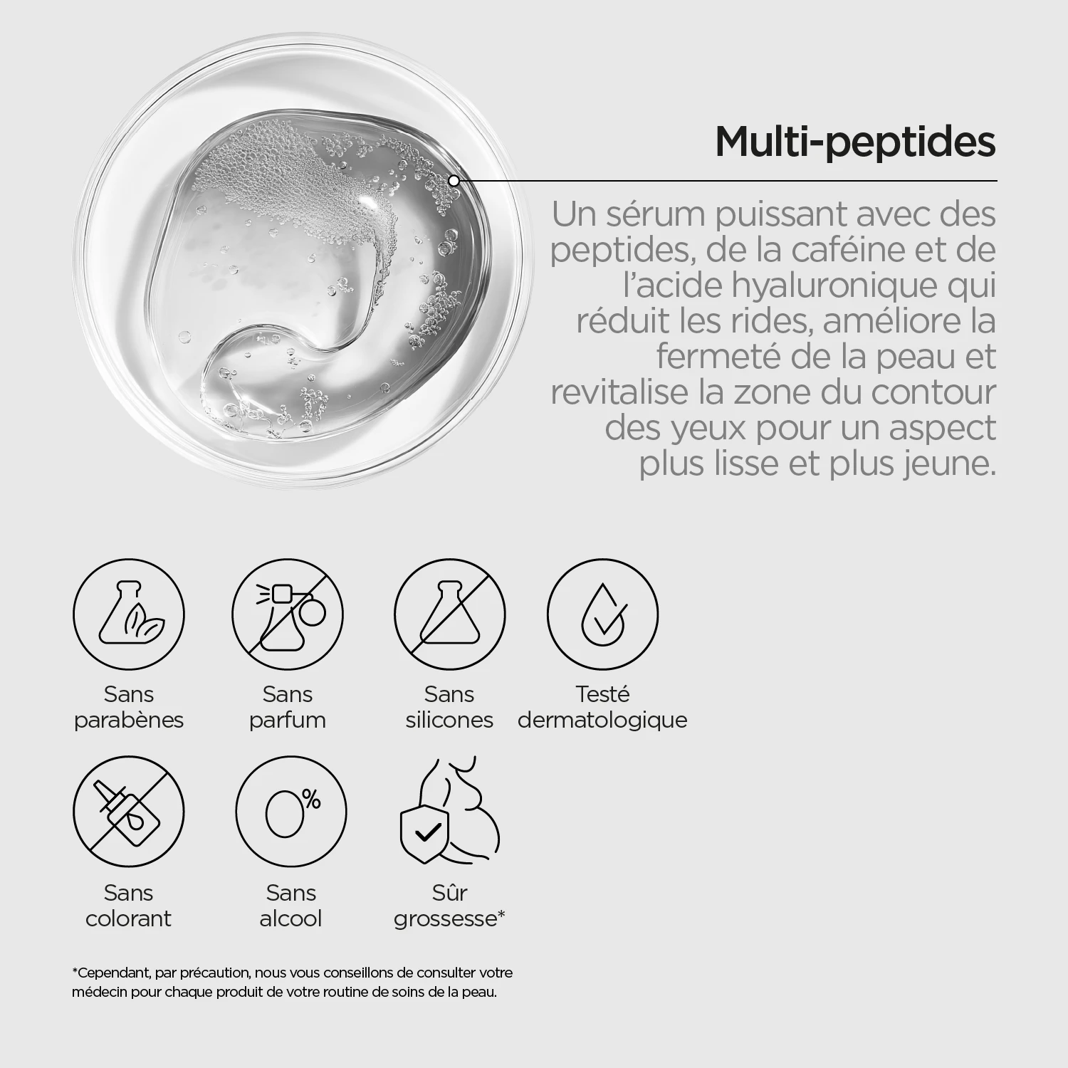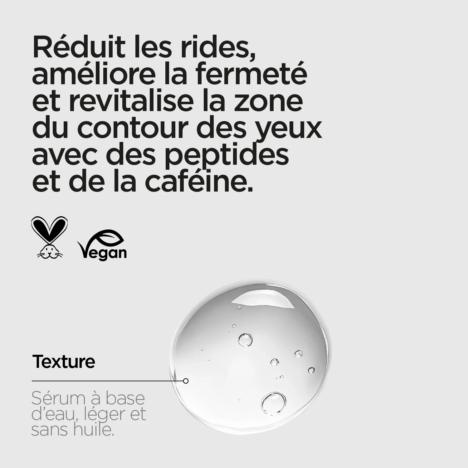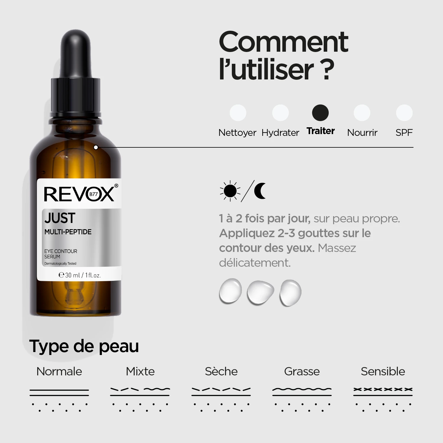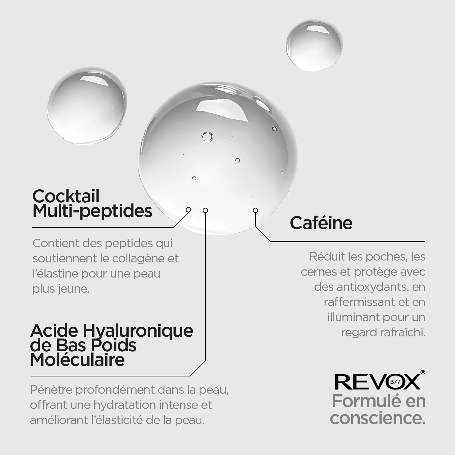 REVOX B77 JUST MULTI-PEPTIDE SERUM FOR EYE CONTOUR est conçu pour transformer la peau du contour des yeux et apporter à cette zone délicate un soin ultime, en utilisant les divers avantages du cocktail de multi peptides contenu dans la formule. Les peptides sont des chaînes d’acides aminés et les éléments constitutifs des protéines. Ils jouent donc un rôle essentiel dans l’élasticité et la santé de la peau. Ce sérum aide à améliorer l’apparence des ridules dans la région du contour des yeux et à renforcer la peau. La formule aide à lutter contre les poches et la fatigue qui peuvent ternir l’aspect du contour de l’œil et stimule la production de collagène pour augmenter la fermeté. La peau est ainsi éclaircie, rafraîchie, hydratée et plus lisse.