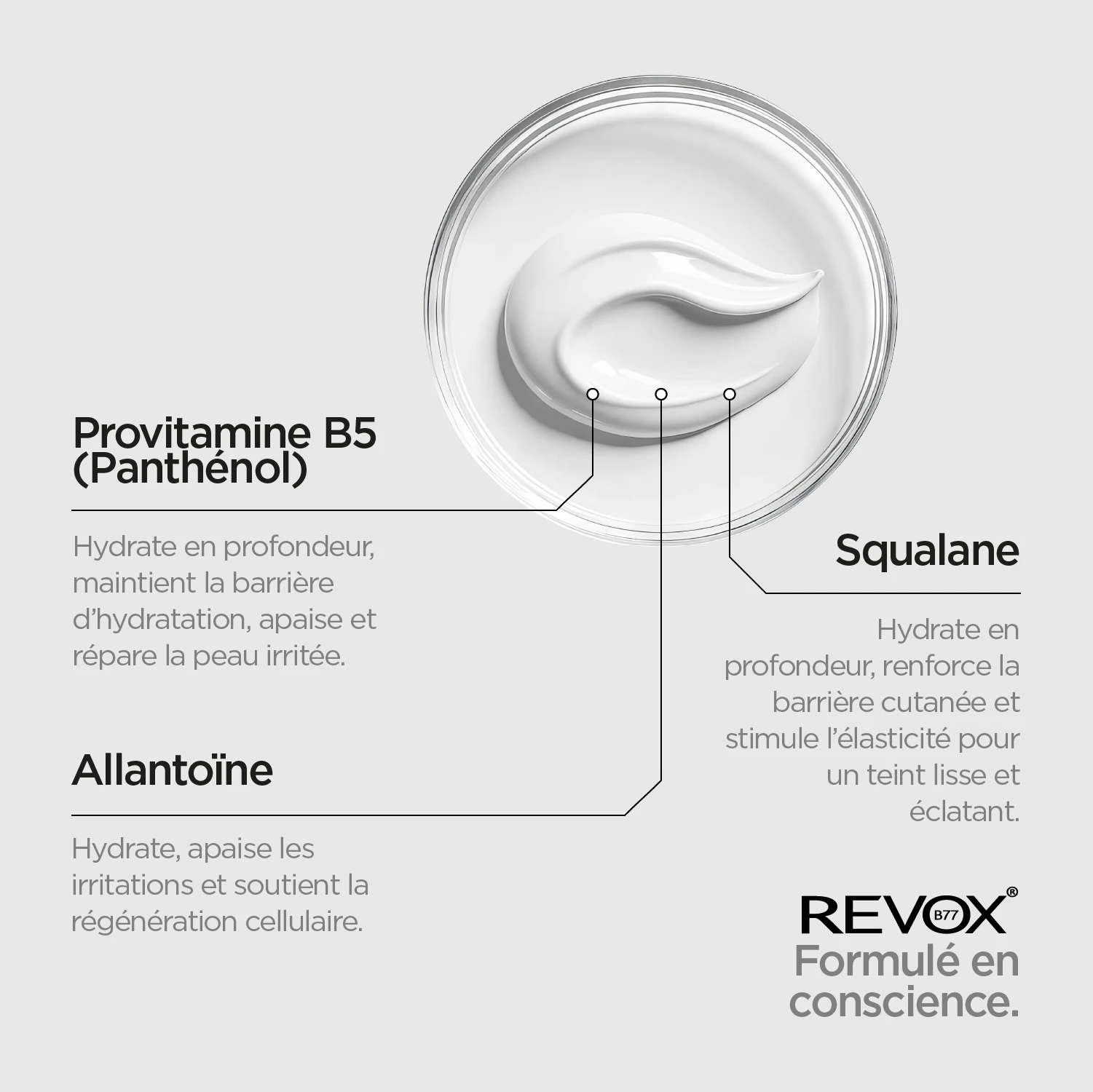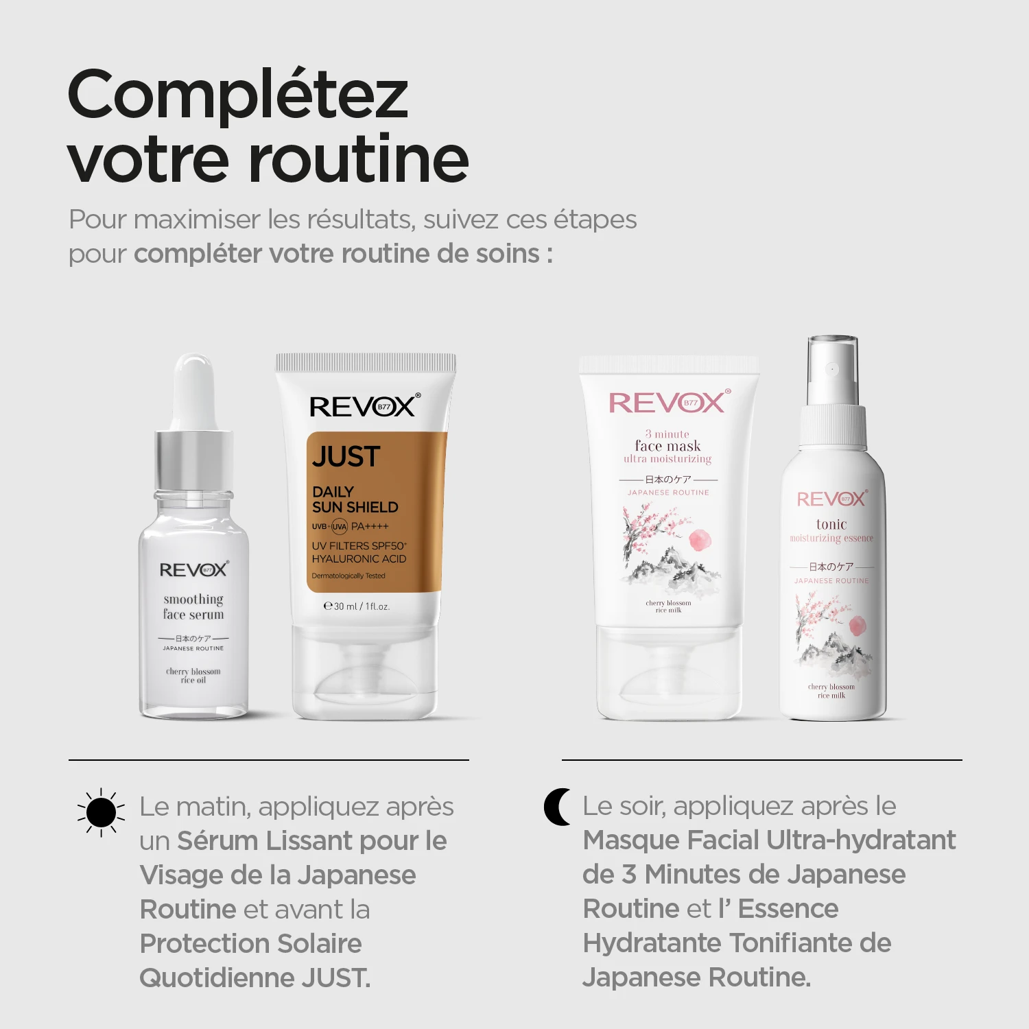 REVOX B77 JAPANESE ROUTINE FACE CREAM LIGHT TEXTURE. Une formule active à la consistance d’un gel onctueux. Après avoir pénétré dans la peau, il la lisse et l’hydrate immédiatement. La crème est riche en acide hyaluronique, qui lie l’eau dans l’épiderme, assurant une hydratation longue durée. L’huile de soja renforce et tonifie la peau. La fleur de cerisier du Japon favorise la régénération de la peau et le lait de riz neutralise les effets nocifs des radicaux libres.![]()