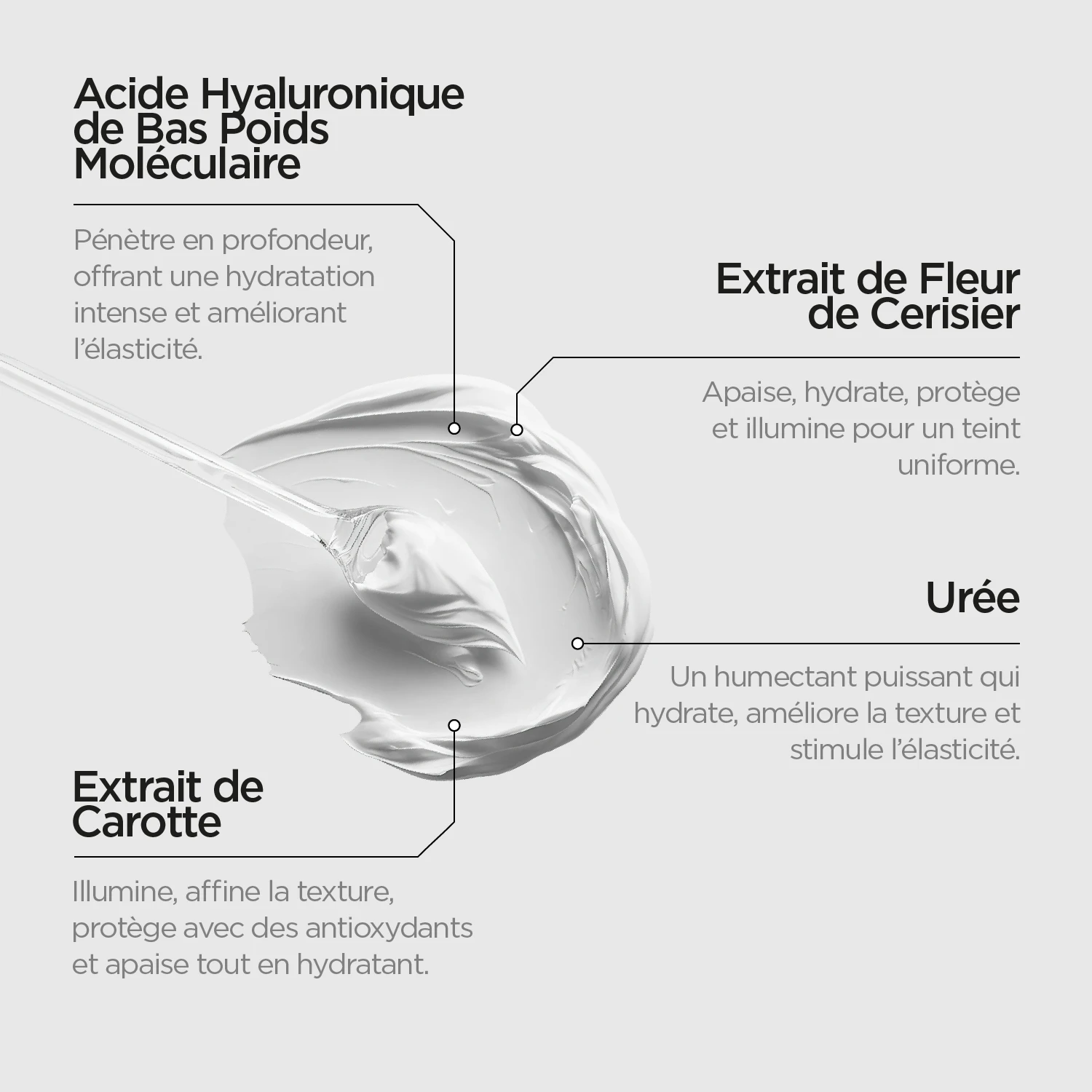 Ingrédients / Ingrédients : Eau/ Aqua, Urée, Alcool cétéarylique, Coco – Caprylate/ Caprate, Glycérine, Ceteareth-20, Huile de soja / Glycine Soja Oil, Cétéarate de glycol, Maltooligosyl Glucoside, Hydrolysat d’amidon hydrogéné, Triglycéride caprylique / caprique, Extrait de riz / Extrait d’Oryza Sativa, protéine de riz hydrolysée, hyaluronate de sodium, squalane, extrait de fleur de cerisier/extrait de fleur de Prunus Serrulata, allantoïne, phénoxyéthanol, parfum/parfum, acrylates/polymère croisé d’acrylate d’alkyle C10-30, triéthanolamine, EDTA disodique, acide citrique, benzoate de sodium, Sorbate de potassium, octadécyl di-t-butyl-4-hydroxyhydrocinnamate, hexyl cinnamal, linalol, limonène.