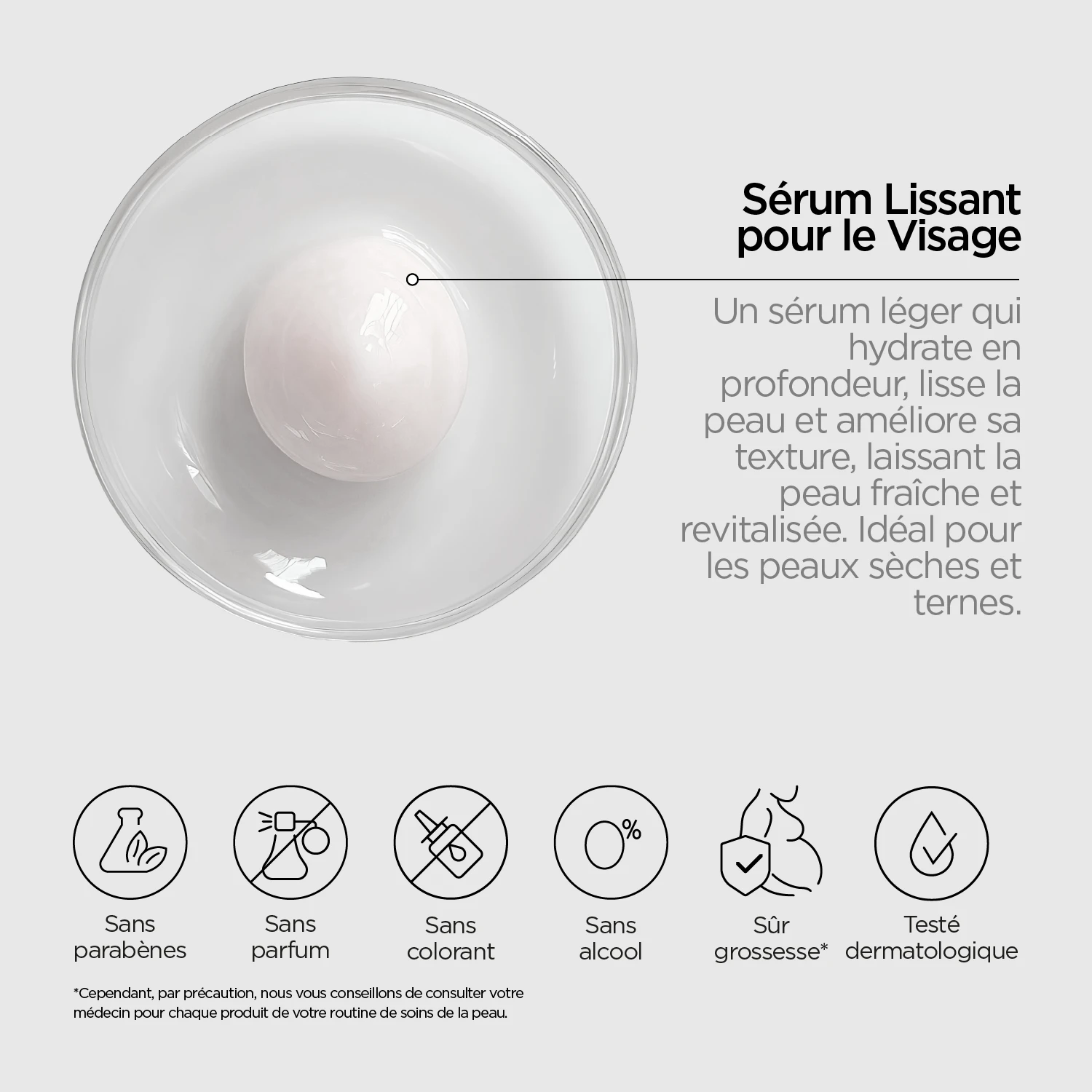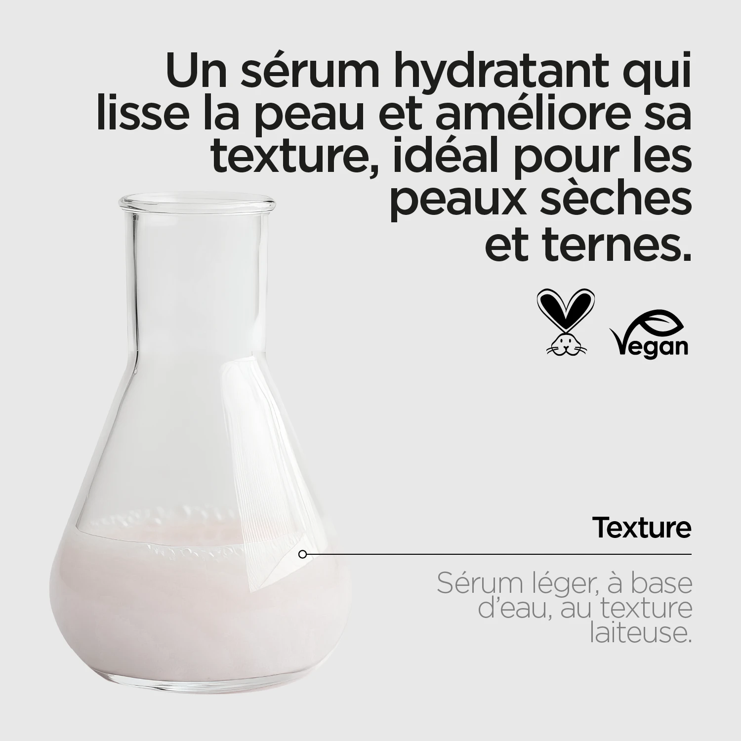 Sa formule délicate à la consistance liquide donne l’impression de lisser et de lifter instantanément la peau du visage. La fleur de cerisier japonais, nourrissante et détoxifiante, favorise la régénération de la peau en la protégeant de la perte d’eau. L’acide hyaluronique – l’emblématique « source de jeunesse » – lie l’eau dans l’épiderme et assure un bon équilibre du niveau d’hydratation. Il réduit la visibilité des rides fines. L’huile de riz améliore l’élasticité de la peau, tandis que l’allantoïne complète le lissage.