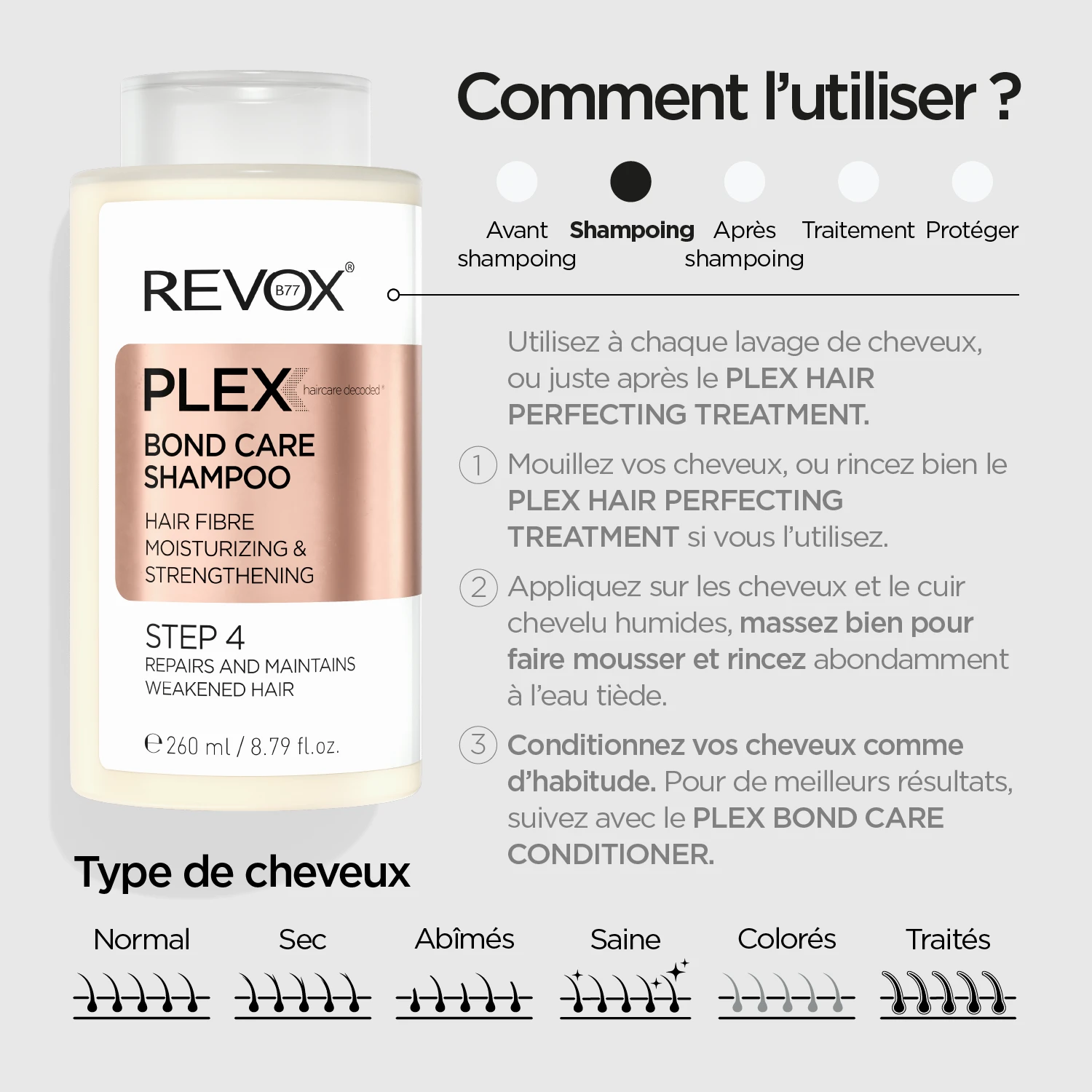 Puis-je l’utiliser quotidiennement ? Oui, le shampooing et l’après-shampooing REVOX B77 PLEX BOND CARE sont formulés pour un usage quotidien.