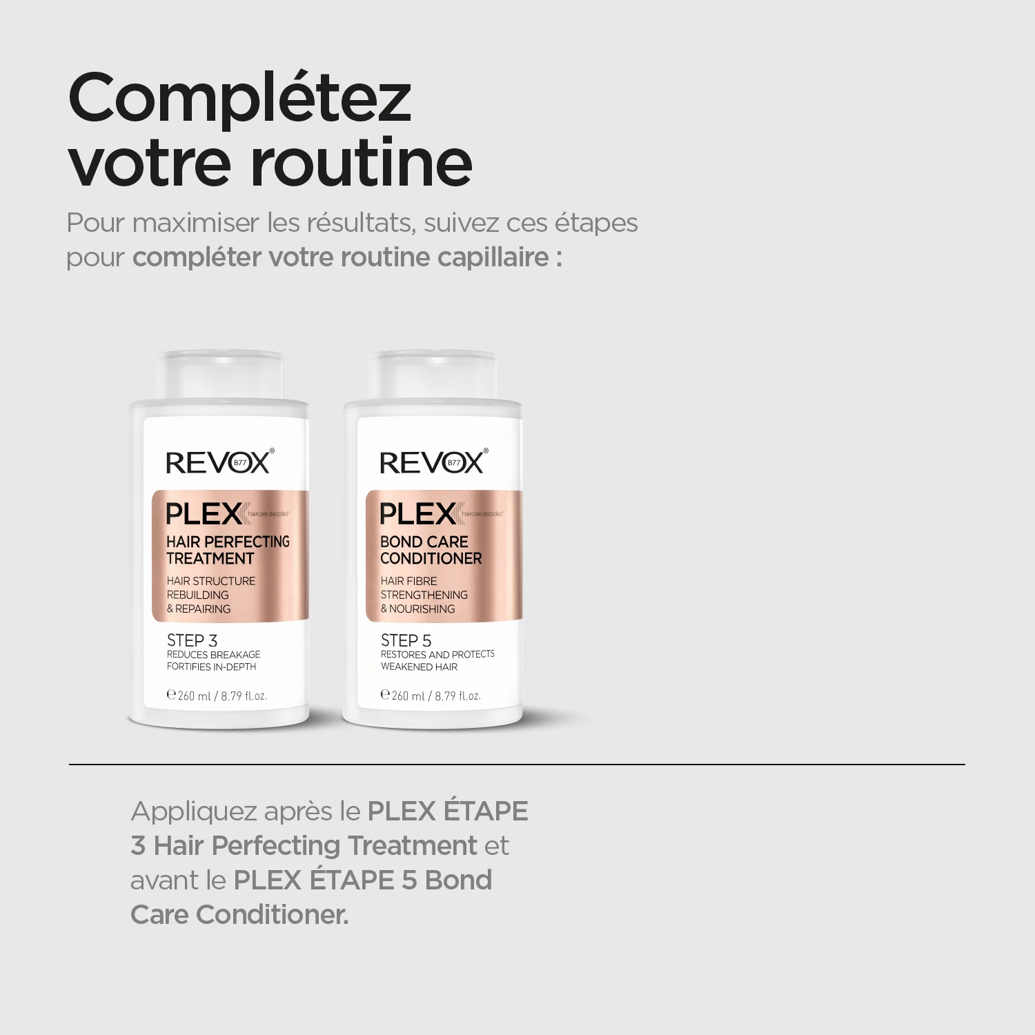 Utilisez chaque fois que vous vous lavez les cheveux ou juste après le TRAITEMENT PERFECTEUR DE CHEVEUX REVOX B77 PLEX.
