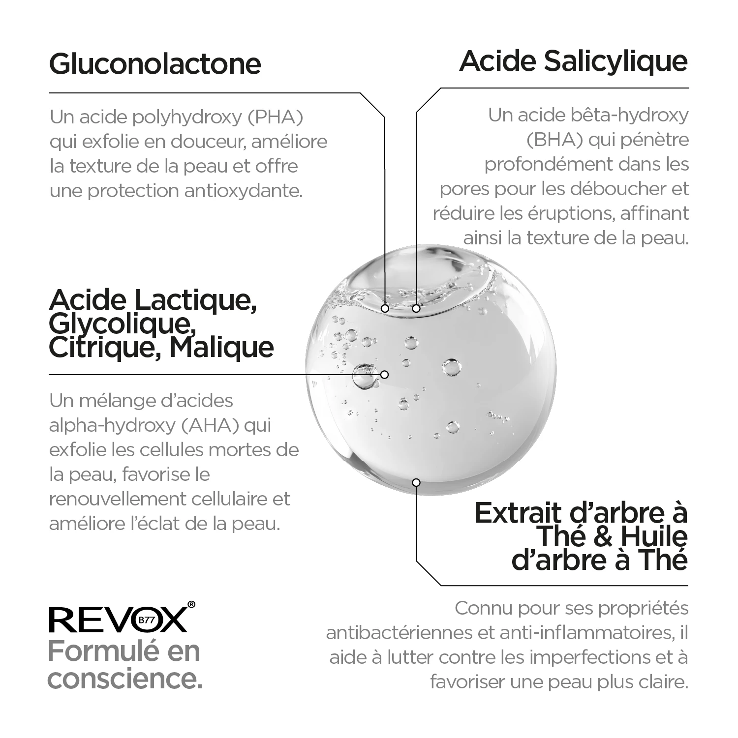 Le tonique doux pour le visage contient un mélange d’AHA, de BHA et de PHA, qui aide à éliminer les cellules mortes de la peau et à nettoyer les pores. L’extrait d’arbre à thé contenu dans la formule possède des propriétés apaisantes qui calment et rafraîchissent la peau. Le niacinamide aide à protéger la peau contre la perte d’hydratation et à la régénérer. L’acide hyaluronique et l’urée apportent une sensation de douceur à la peau. L’utilisation systématique du produit procure une sensation générale de peau resurfacée. Combiner avec d’autres produits de la ligne REVOX B77 ZITCARE® pour obtenir des résultats optimaux.Quand l’utiliser ? Le soir