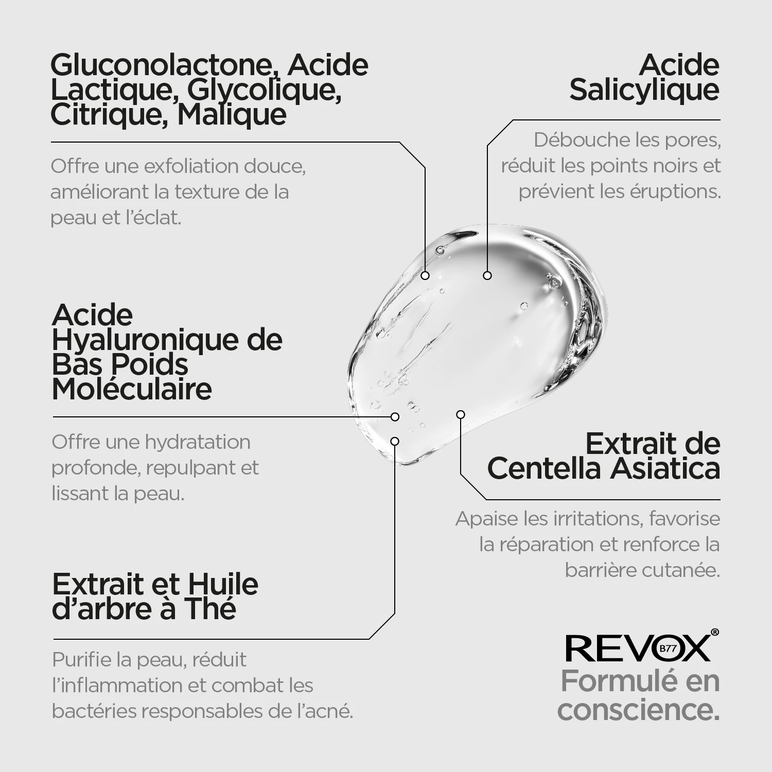 Ingrédients: Water/Aqua, Sodium Lauryl Sulfate, Glycerin, Sodium Lauroyl Sarcosinate, Cocamidopropyl Betaine, PEG-40 Hydrogenated Castor Oil, Gluconolactone, Lactic Acid, Glycolic Acid, Citric Acid, Malic Acid, Salicylic Acid, Centella Asiatica Extract / Centella Asiatica Leaf Extract, Sodium Hyaluronate, Tea Tree Extract / Melaleuca Alternifolia Leaf Extract, Hydroxyethylcellulose, Tea Tree Oil / Melaleuca Alternifolia Leaf Oil, Phenoxyethanol, Alcohol Denat., Fragrance / Parfum, Sodium Benzoate, Potassium Sorbate, Disodium EDTA.