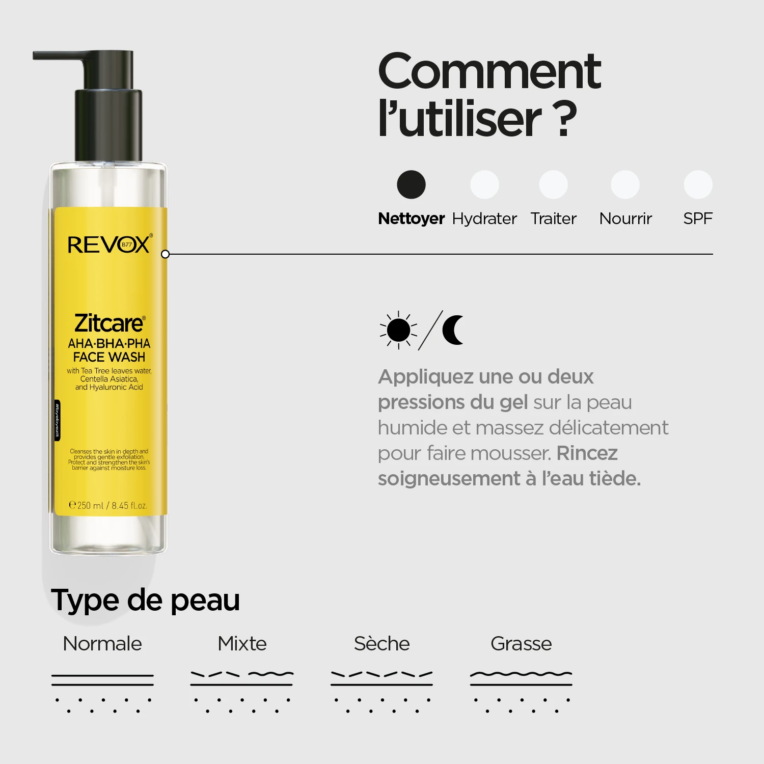 Mode d’emploi: Appliquer une ou deux pompes de gel sur la peau humide, en évitant le contour des yeux, et masser doucement pour faire mousser. Rincer abondamment à l’eau tiède. Avant la première application, il est recommandé d’effectuer un test de sensibilité.